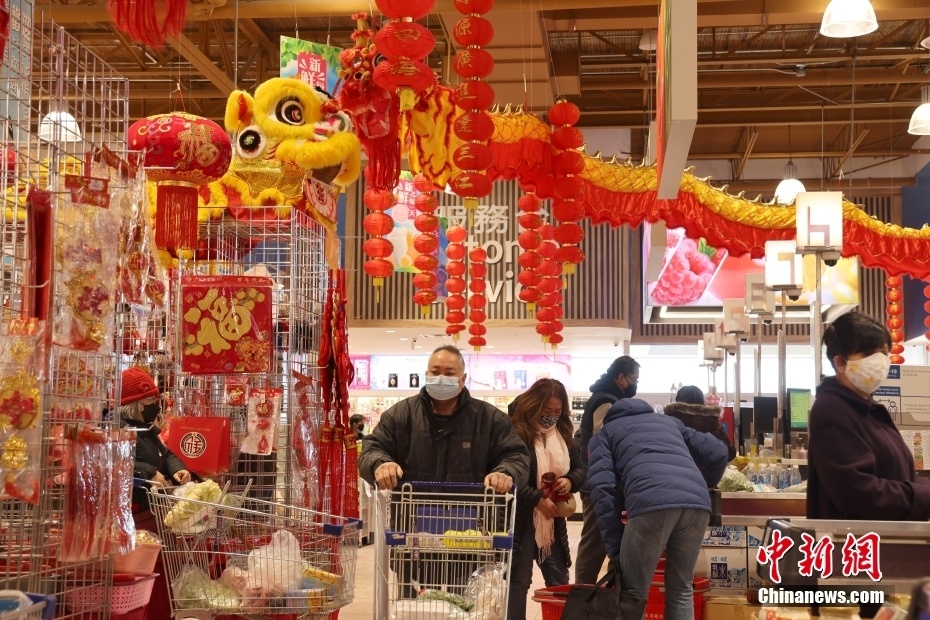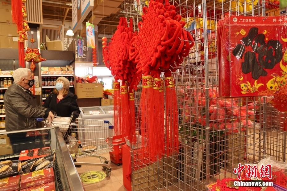当地时间1月28日,加拿大多伦多一家华人超市挂起中国结、“福”字中式挂件等营造浓郁的节日氛围,吸引顾客采购年货,迎接即将到来的壬寅虎年新春。中新社记者 余瑞冬 摄