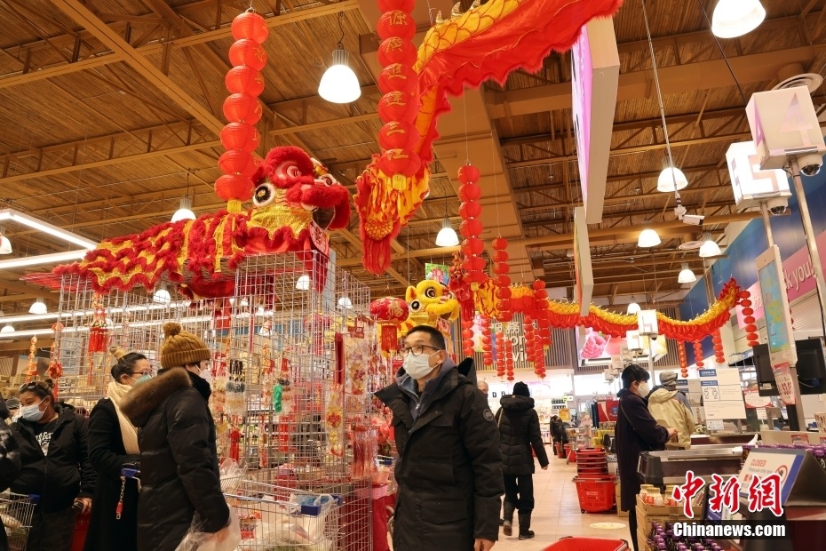 当地时间1月28日,加拿大多伦多一家华人超市用红灯笼、龙灯、醒狮等营造浓郁的节日氛围,吸引顾客采购年货,迎接即将到来的壬寅虎年新春。中新社记者 余瑞冬 摄