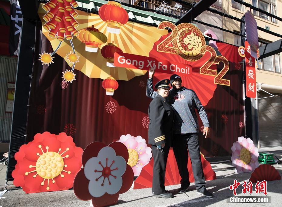当地时间1月29日,市民在美国旧金山唐人街春节花市上与新年主题装置合影。在一年一度的旧金山唐人街春节花市上,市民不但能购买到各种节日用品,还可以欣赏到舞狮、舞扇以及杂技等中国民俗表演。2021年,旧金山唐人街春节花市因新冠疫情而取消。中新社记者 刘关关 摄