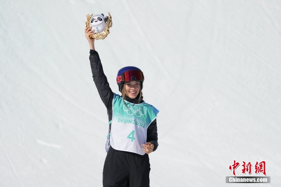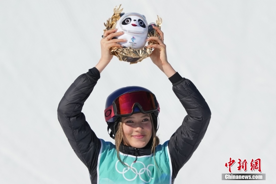 2月8日,北京冬奥会自由式滑雪女子大跳台决赛在首钢滑雪大跳台进行,12名顶尖选手参与角逐。经过3轮较量,中国选手谷爱凌以总成绩188.25分获得冠军。图为中国选手谷爱凌举起属于自己的“金墩墩”。中新社记者 毛建军 摄