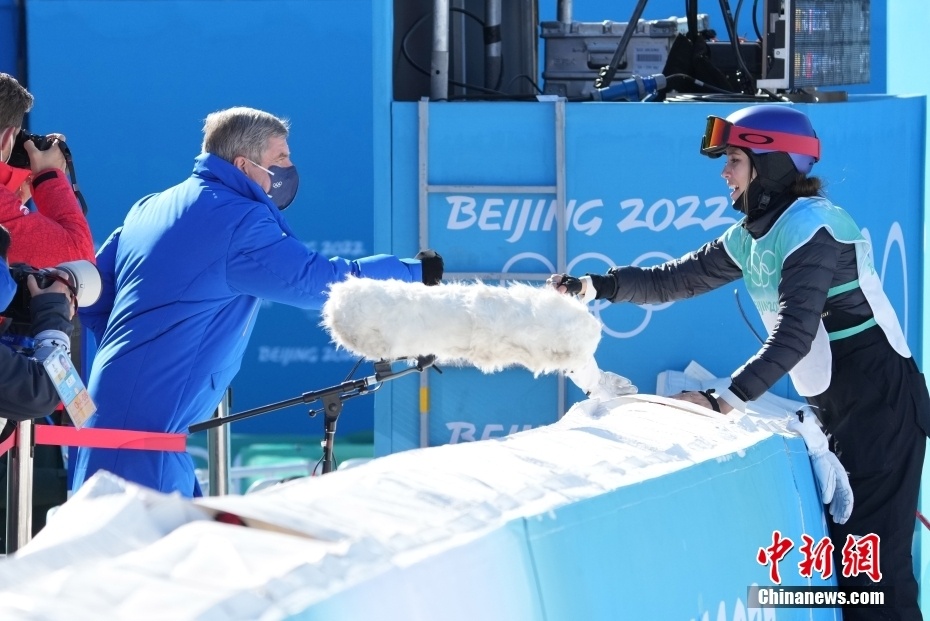 国际奥委会主席巴赫与谷爱凌击拳庆祝。中新社记者 毛建军 摄
