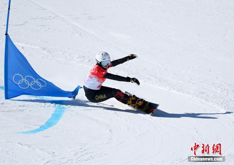2月8日,北京冬奥会单板滑雪女子平行大回转比赛资格赛在张家口云顶滑雪公园进行。中国队共有两位选手参赛,宫乃莹最终排名第19名,臧汝心获得第25名,二人均无缘决赛。图为宫乃莹在比赛中。 中新社记者 富田 摄
