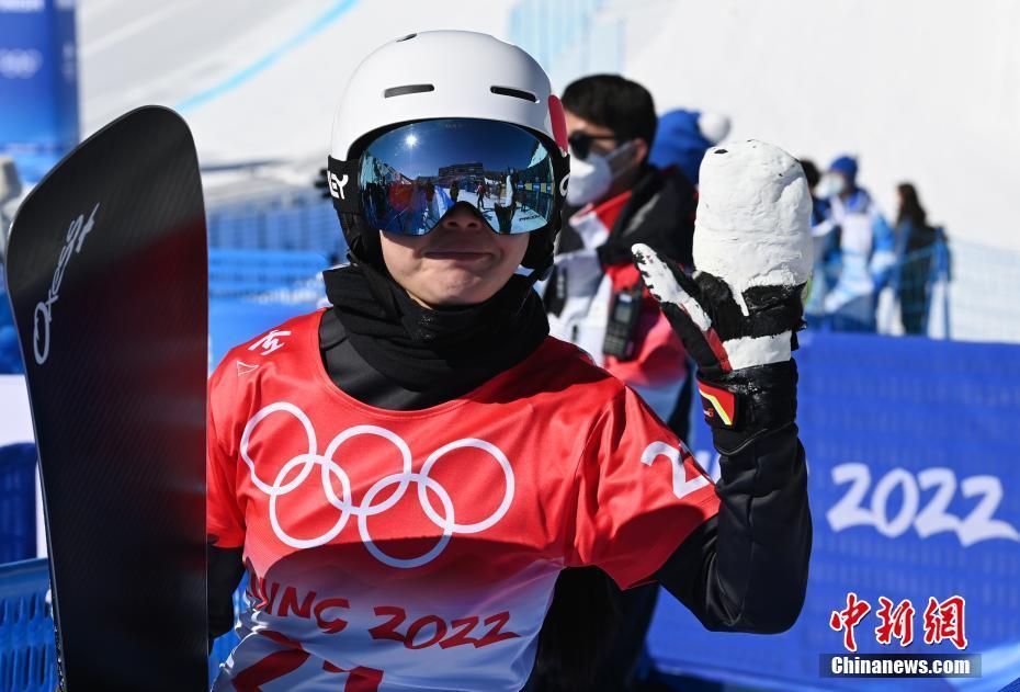 2月8日,北京冬奥会单板滑雪女子平行大回转比赛资格赛在张家口云顶滑雪公园进行。中国队共有两位选手参赛,宫乃莹最终排名第19名,臧汝心获得第25名,二人均无缘决赛。图为臧汝心挥手走出赛场。 中新社记者 翟羽佳 摄