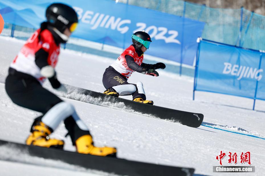 2月8日,北京冬奥会单板滑雪女子平行大回转比赛资格赛在张家口云顶滑雪公园进行。中国队共有两位选手参赛,宫乃莹最终排名第19名,臧汝心获得第25名,二人均无缘决赛。图为宫乃莹(右)在比赛中。 中新社记者 富田 摄