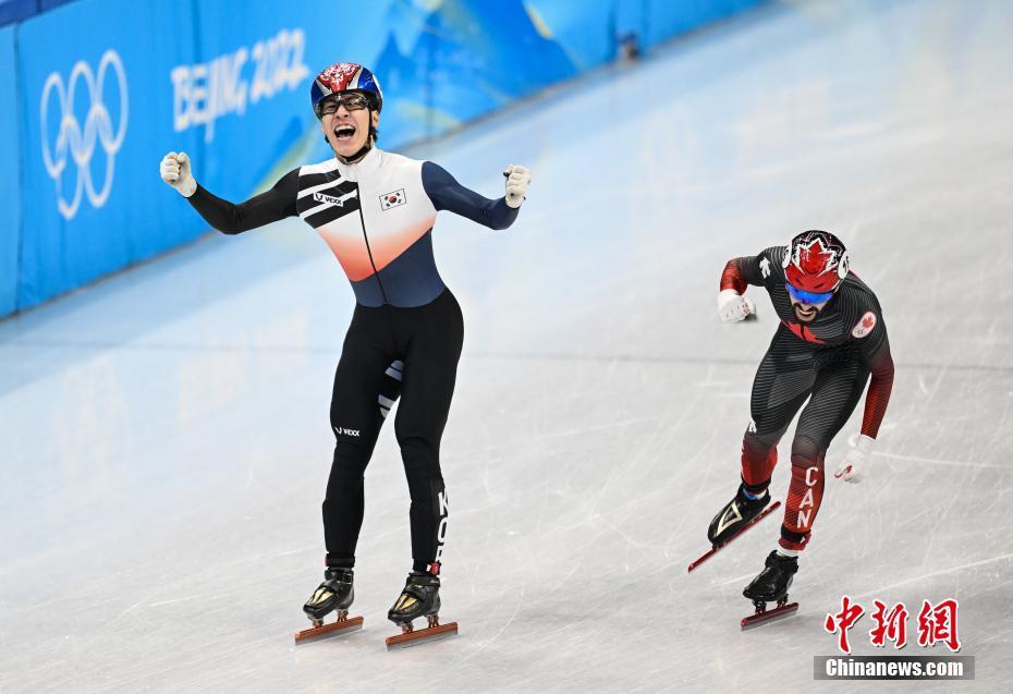 2月9日,北京2022年冬奥会短道速滑项目男子1500米决赛在首都体育馆举行。韩国选手黄大宪夺得冠军。这是韩国代表团在本届北京冬奥会上获得的首枚金牌。图为韩国选手黄大宪(左)和加拿大选手史蒂文·杜博伊斯(右)冲过终点。 中新社记者 毛建军 摄
