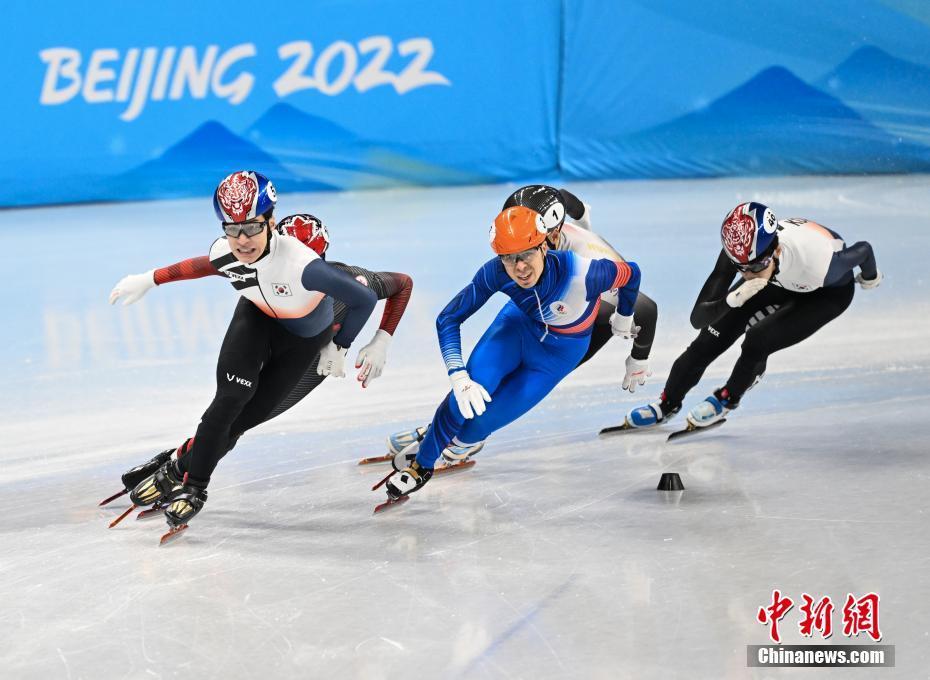 2月9日,北京2022年冬奥会短道速滑项目男子1500米决赛在首都体育馆举行。韩国选手黄大宪夺得冠军。这是韩国代表团在本届北京冬奥会上获得的首枚金牌。图为韩国选手黄大宪(左)在比赛中。 中新社记者 毛建军 摄