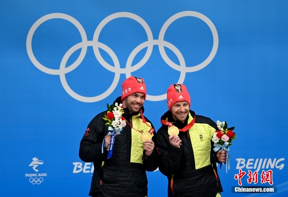2月9日,北京2022年冬奥会双人雪橇项目在北京延庆国家雪车雪橇中心举行。德国传奇组合托比亚斯·文德尔/托比亚斯·阿尔特以两轮1分56秒554的好成绩夺得冠军,实现了该项目三连冠。图为托比亚斯·文德尔/托比亚斯·阿尔特在领奖台。 中新社记者 何蓬磊 摄