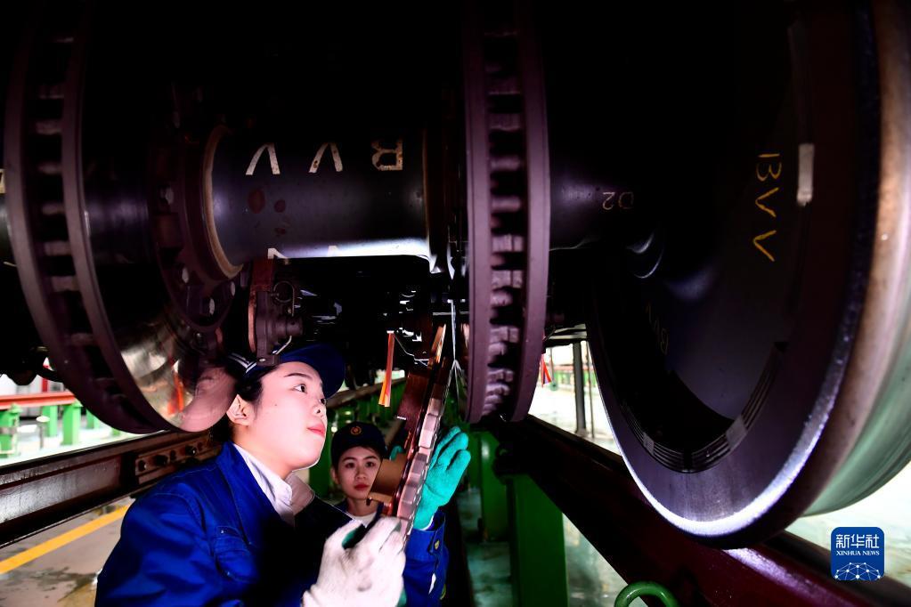 2月10日,在国铁济南局青岛动车段济南动车所,“动车女医生”吕瑞杰在更换动车组制动闸片。