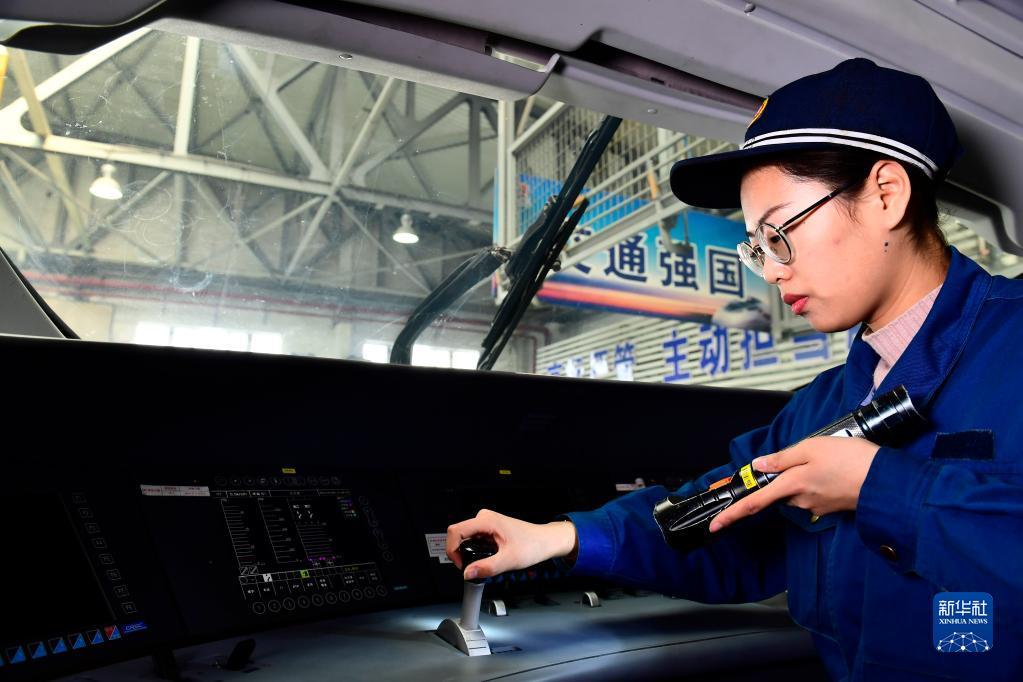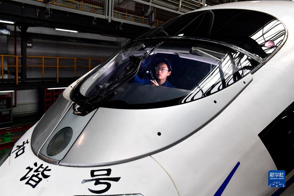 2月10日,在国铁济南局青岛动车段济南动车所,“动车女医生”杨静娴对动车组司机室的雨刮器、制动手柄、遮阳帘进行检查和试验。