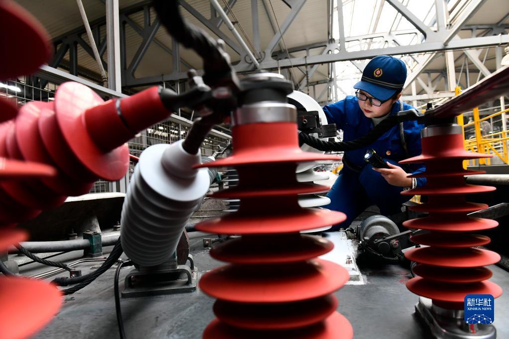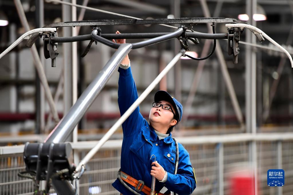 2月10日,在国铁济南局青岛动车段济南动车所,“动车女医生”肖云霄在检查动车组车顶主断路器状态。