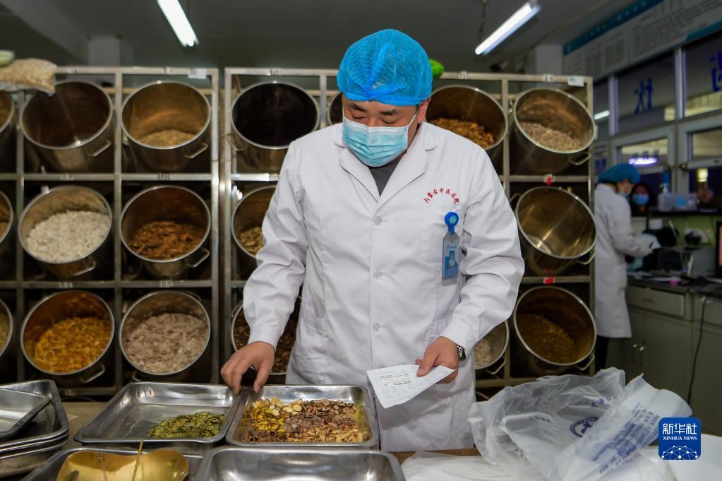 2月25日,内蒙古自治区中医医院药剂师根据处方调配中药。