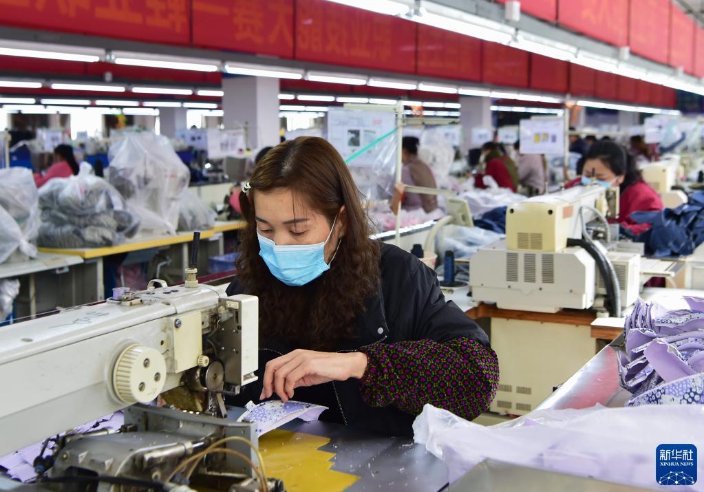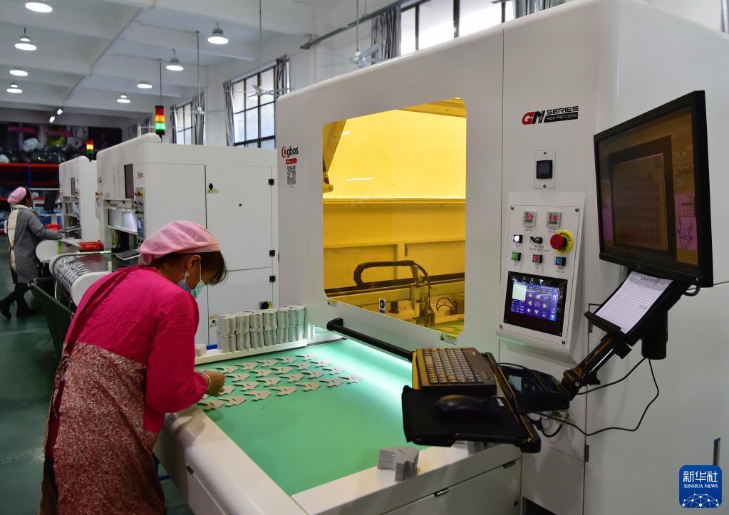 在一家鞋企生产线上,工人在使用新设备生产出口欧美的鞋面部件(2月25日摄)。