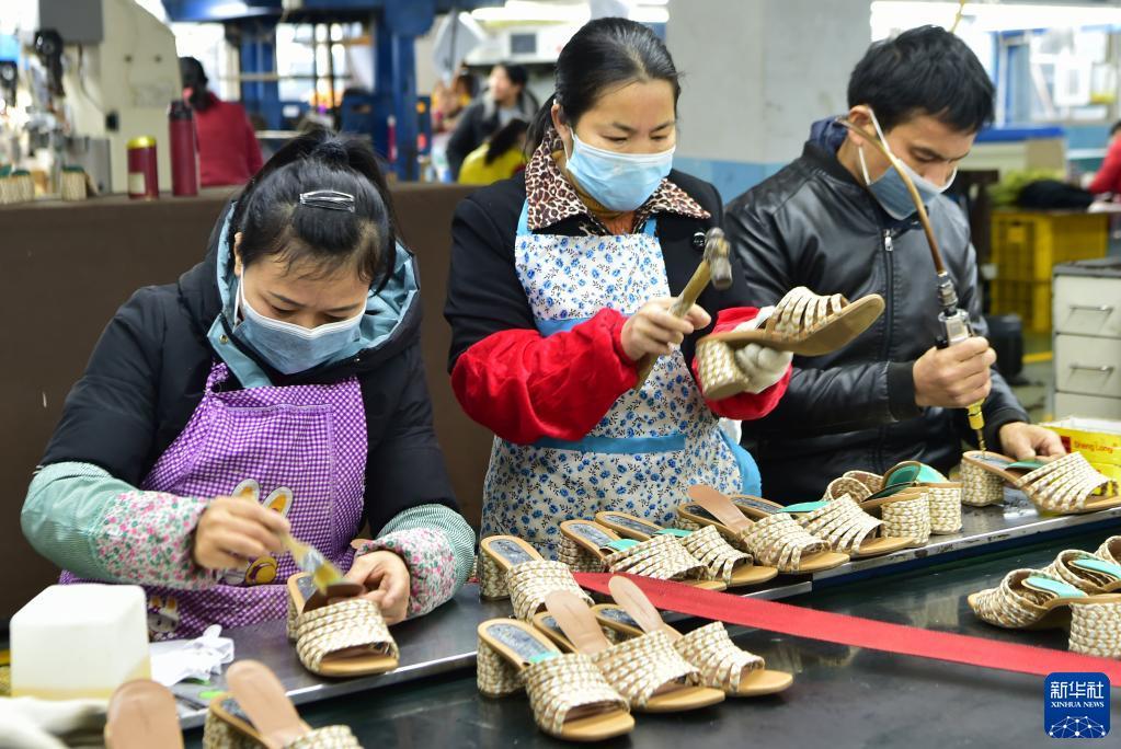莆田一家鞋企的工人正在生产出口欧美的夏季凉拖鞋(2月25日摄)。