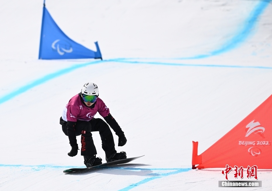 3月6日,中国选手耿焱红在比赛中,当日,北京2022年冬残奥会残奥单板滑雪女子障碍追逐 - LL2级资格赛在张家口云顶滑雪公园举行,中国选手耿焱红以1分16秒36的成绩晋级。17岁的耿焱红是北京冬残奥会中国体育代表团最年轻的选手。中新社记者 侯宇 摄