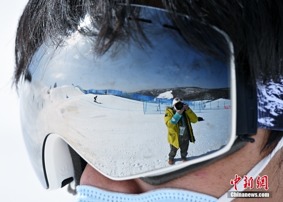 3月6日,北京2022年冬残奥会残奥单板滑雪男子障碍追逐-LL2级资格赛在张家口云顶滑雪公园举行,一名赛道工作人员的雪镜中映出比赛瞬间。 中新社记者 侯宇 摄