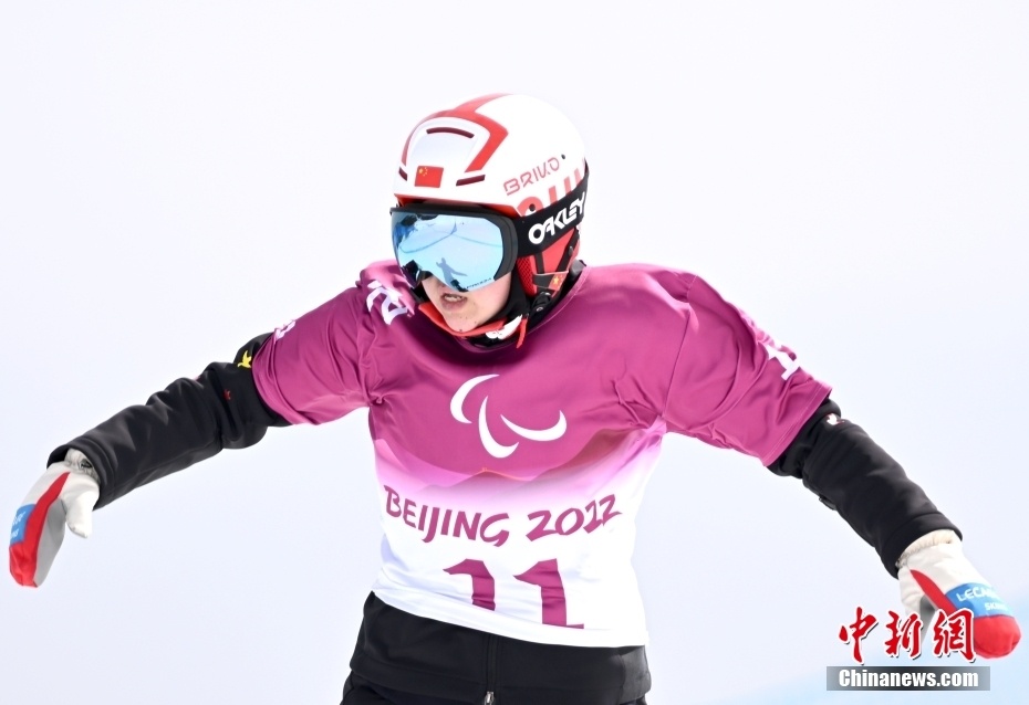 3月6日,北京2022年冬残奥会残奥单板滑雪女子障碍追逐-LL2级资格赛在张家口云顶滑雪公园举行,中国选手胡年佳参赛。中新社记者 侯宇 摄