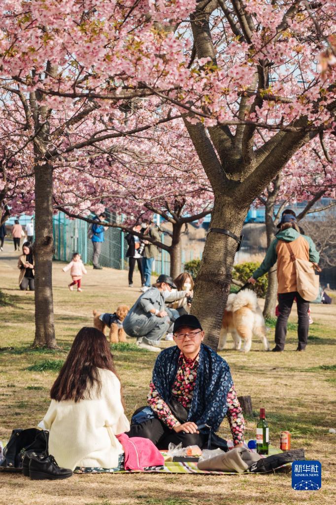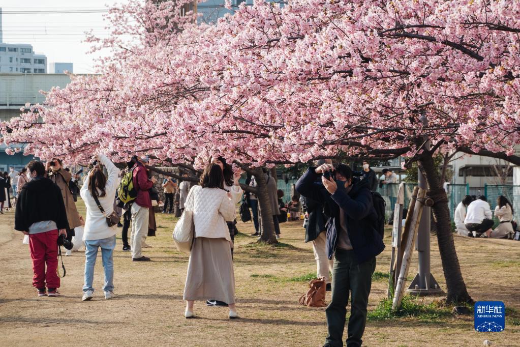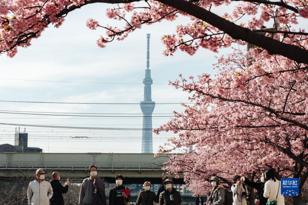 3月9日,人们在日本东京旧中川沿岸欣赏绽放的樱花。