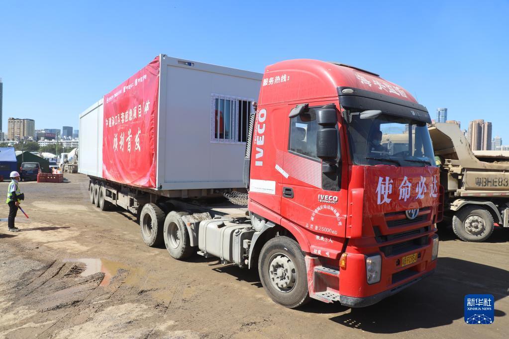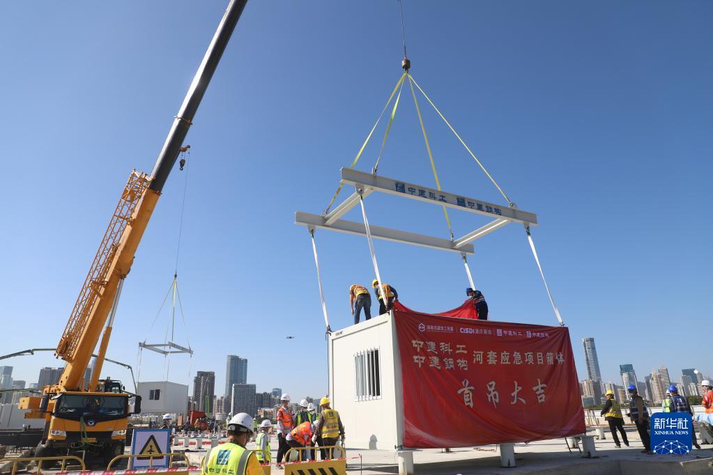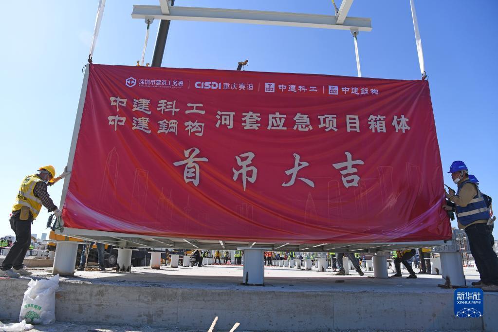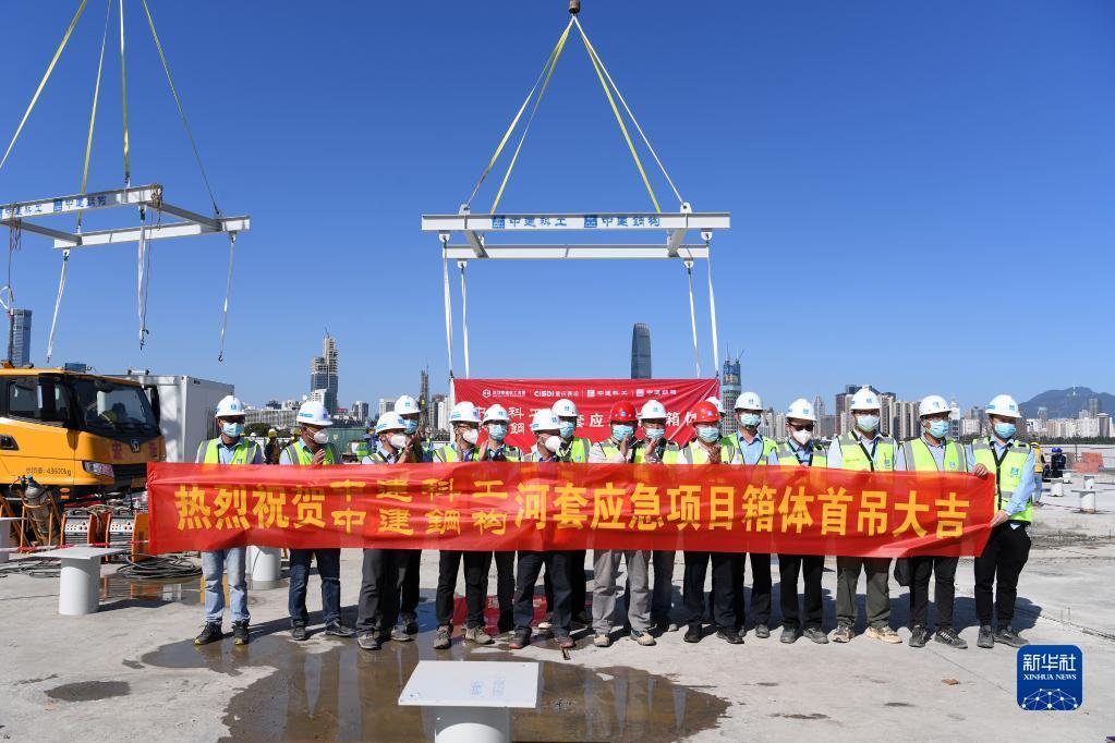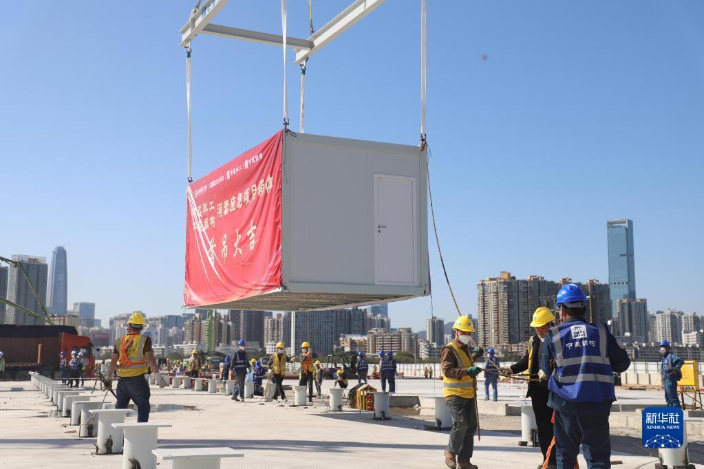 3月9日,中央援建香港应急医院项目首个集成式箱体吊装施工现场。