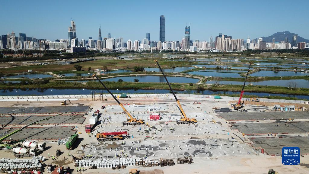 这是3月9日拍摄的中央援建香港应急医院项目首个集成式箱体吊装施工现场(无人机照片)。