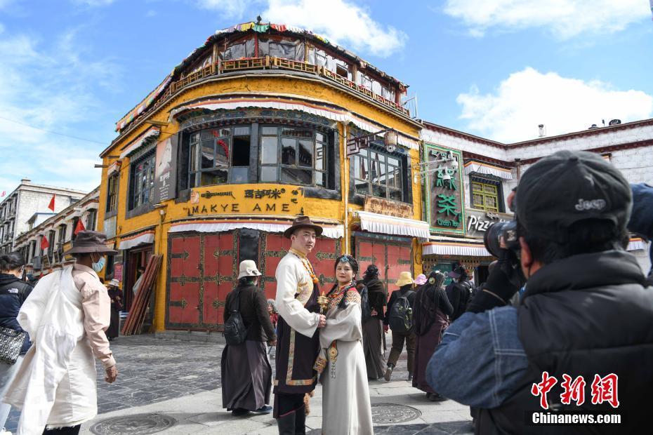 3月14日,游客穿上藏族传统服饰在拉萨市八廓街拍照留念。 中新社记者 贡嘎来松 摄