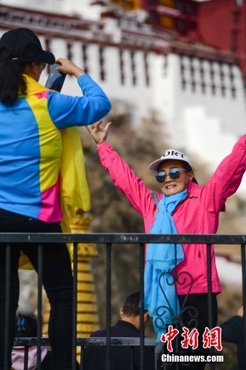 3月15日,游客在拉萨药王山观景台拍照留念。 中新社记者 贡嘎来松 摄