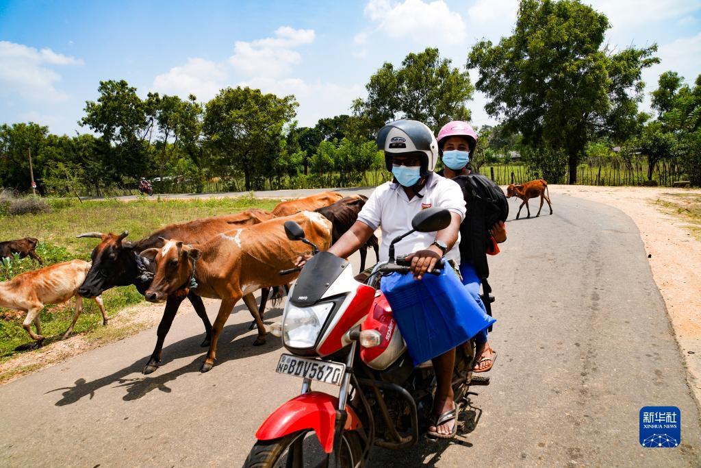 3月11日,在斯里兰卡瓦武尼亚地区,人们乘摩托车经过一条乡道。