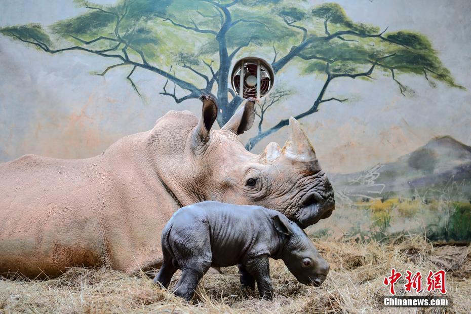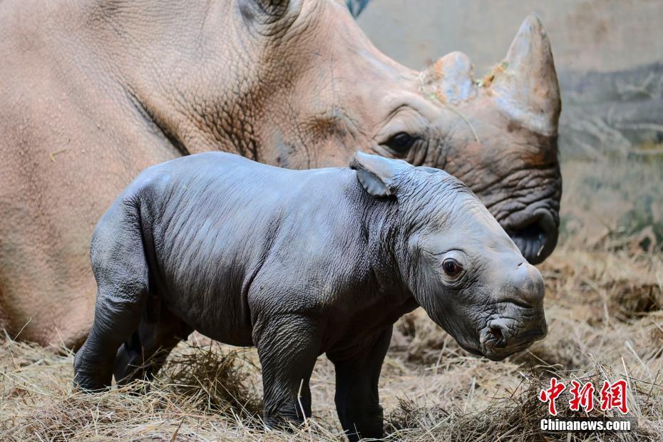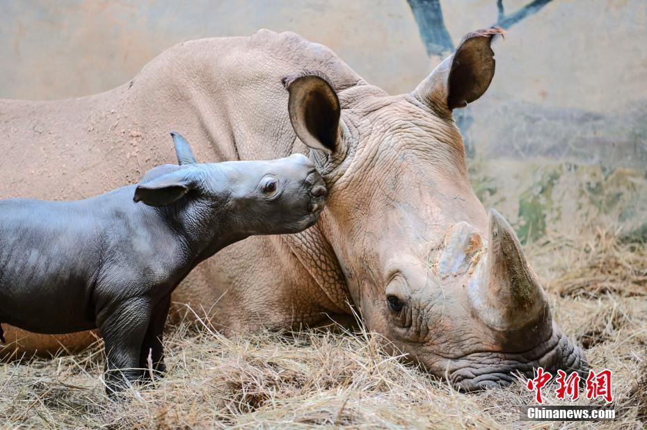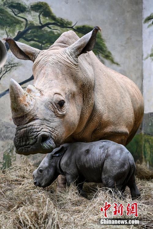 3月29日,广东省广州市,新生的白犀牛幼崽与其母亲“维维”。3月29日凌晨,生活在长隆野生动物世界的白犀牛“维维”成功产下一头雄性幼崽。目前幼崽已经顺利吃上母乳,健康状况良好。 中新社记者 陈骥旻 摄