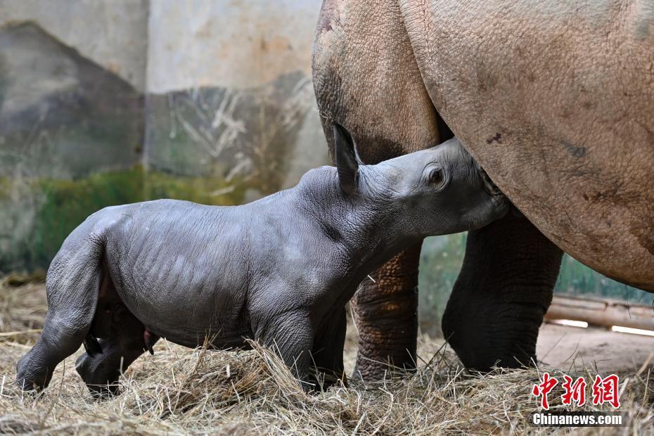 3月29日,广东省广州市,新生的白犀牛幼崽吃奶。3月29日凌晨,生活在长隆野生动物世界的白犀牛“维维”成功产下一头雄性幼崽。目前幼崽已经顺利吃上母乳,健康状况良好。 中新社记者 陈骥旻 摄