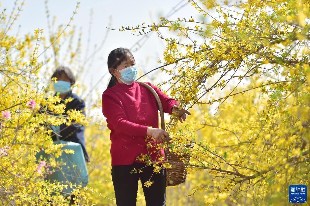 4月7日,河北省行唐县北河乡水泉村村民在中药材种植基地采摘连翘花。