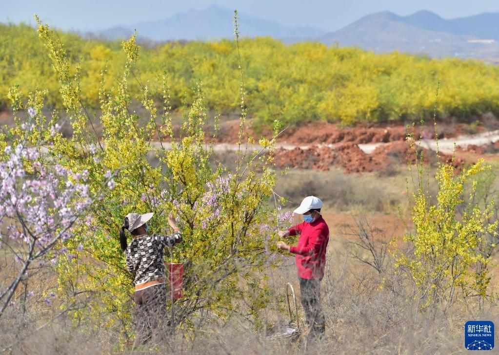 近日,河北省行唐县北河乡水泉村中药材种植基地的连翘花盛开,农民开始采花制茶。近年来,河北省行唐县引导农民在浅山区种植连翘、金银花和黄芩等中药材,促进农民增收。据介绍,目前该县中药材种植面积达5万亩,年产值达2亿元。