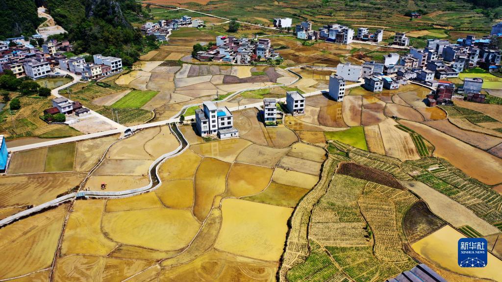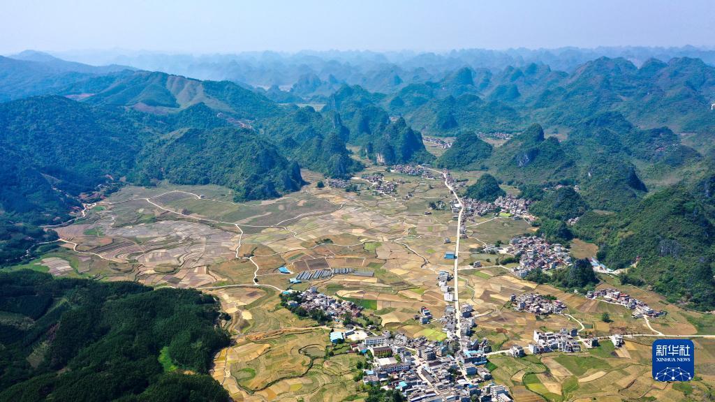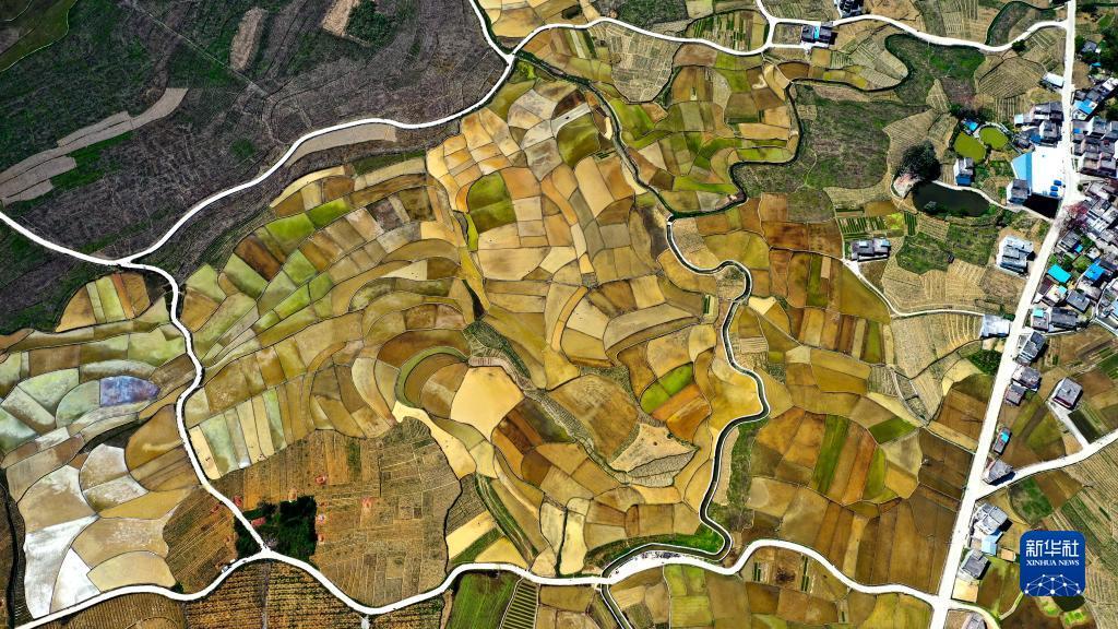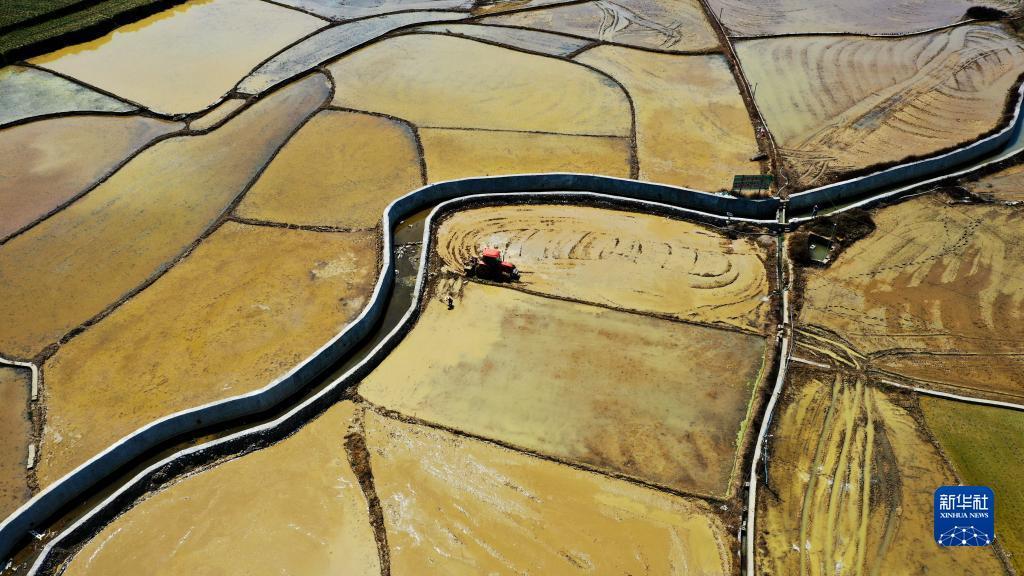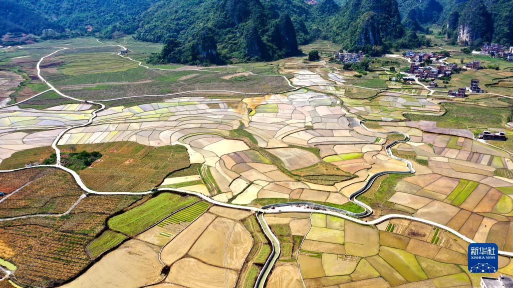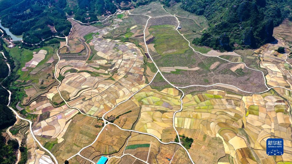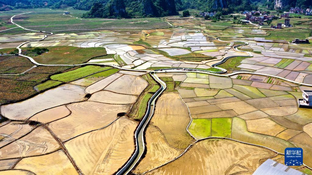 春耕时节,在广西大化瑶族自治县大化镇龙口村富硒水稻种植基地,稻田和村舍构成美丽的乡村风景线。