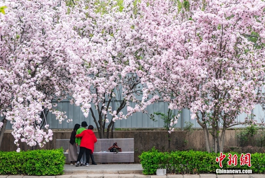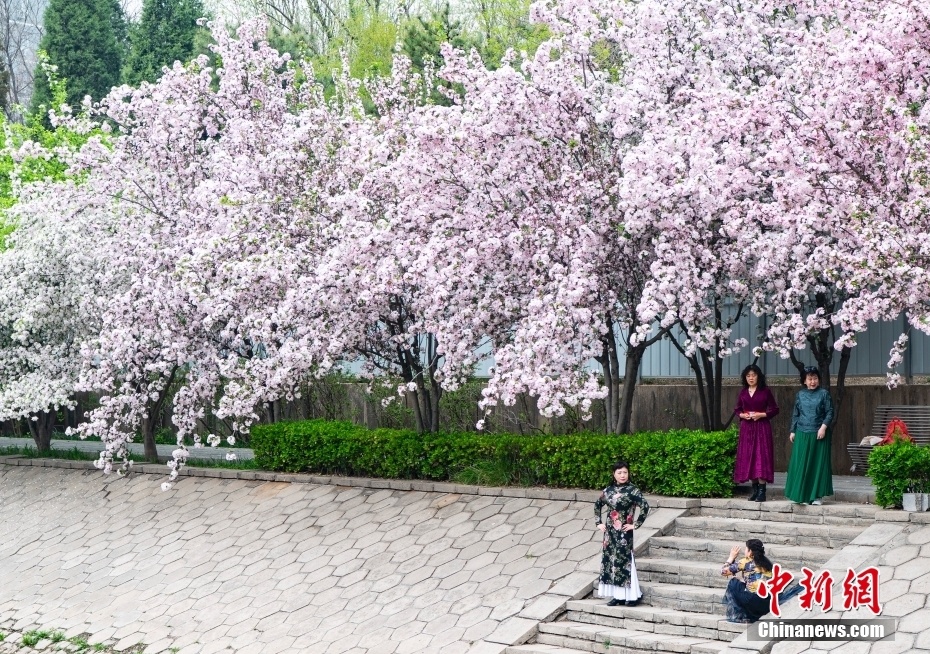 4月11日,北京市朝阳区望京地区的“海棠花溪”花正艳,市民流连其中休憩拍照。 中新社记者 侯宇 摄