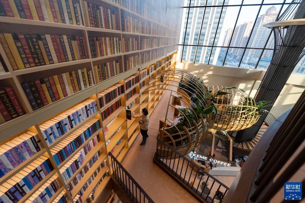 4月15日,书店主理人于冰在哈尔滨众创书局摆放图书。