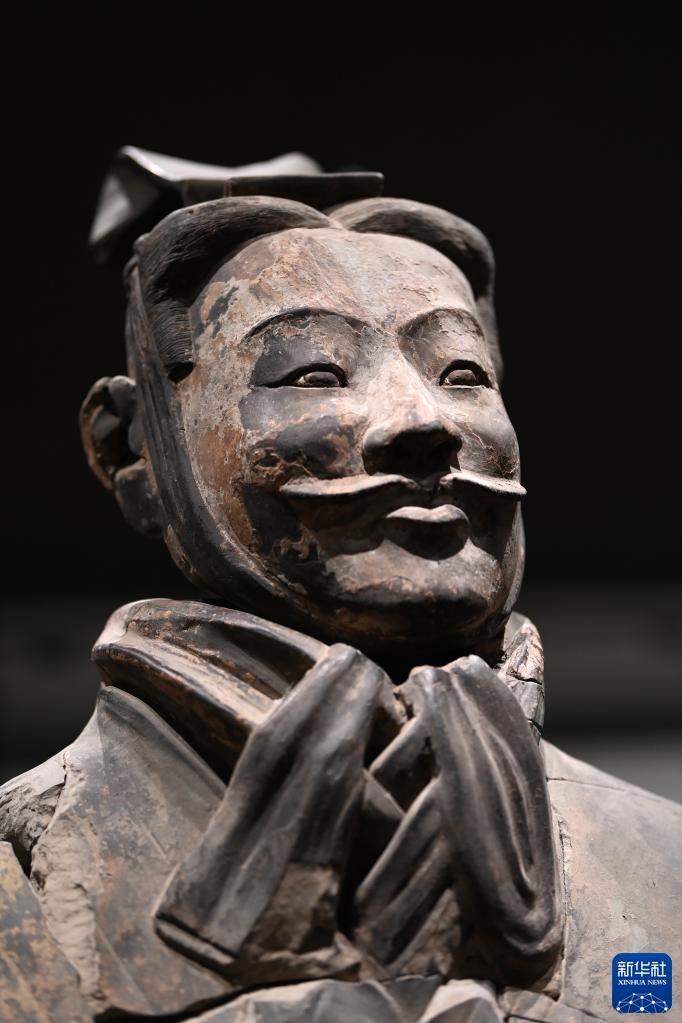 这是陕西考古博物馆展出的秦始皇帝陵园陪葬坑出土的文吏俑(4月16日摄)。