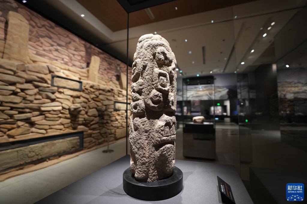 这是陕西考古博物馆展出的神木石峁遗址皇城台出土的神面立柱石雕(4月16日摄)。