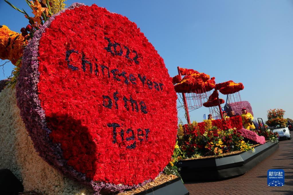 当日,荷兰花车巡游从西部小城诺德韦克市开始,行程约40公里,途经多个城镇。受疫情影响,这项花车巡游活动暂停了两个春季,今年终于重启,主题为“欢庆回忆”。在花车巡游队伍中,海牙中国文化中心用约2万枝鲜花装饰了两组花车造型,庆祝中国和荷兰建交50周年,并向荷兰公众展示中国的虎年生肖文化。