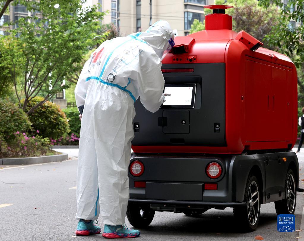 4月25日,上海市嘉定区南翔镇一小区的居民从智能快递车上取货。