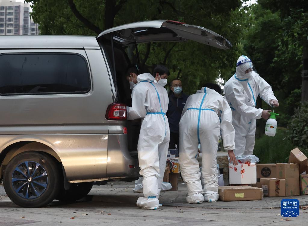 4月25日,工作人员在上海市嘉定区南翔镇一小区门口卸货并对货物进行第一次消杀。