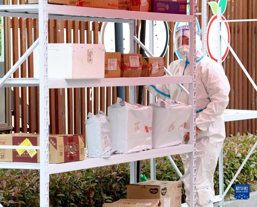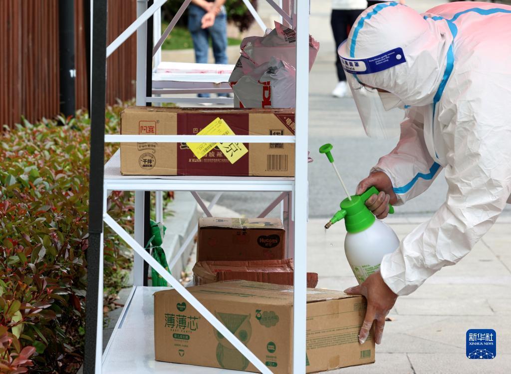 4月25日,在上海市嘉定区南翔镇一小区内,工作人员对“无接触社区保供站”货架上的货物进行二次消杀。