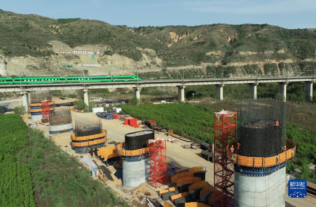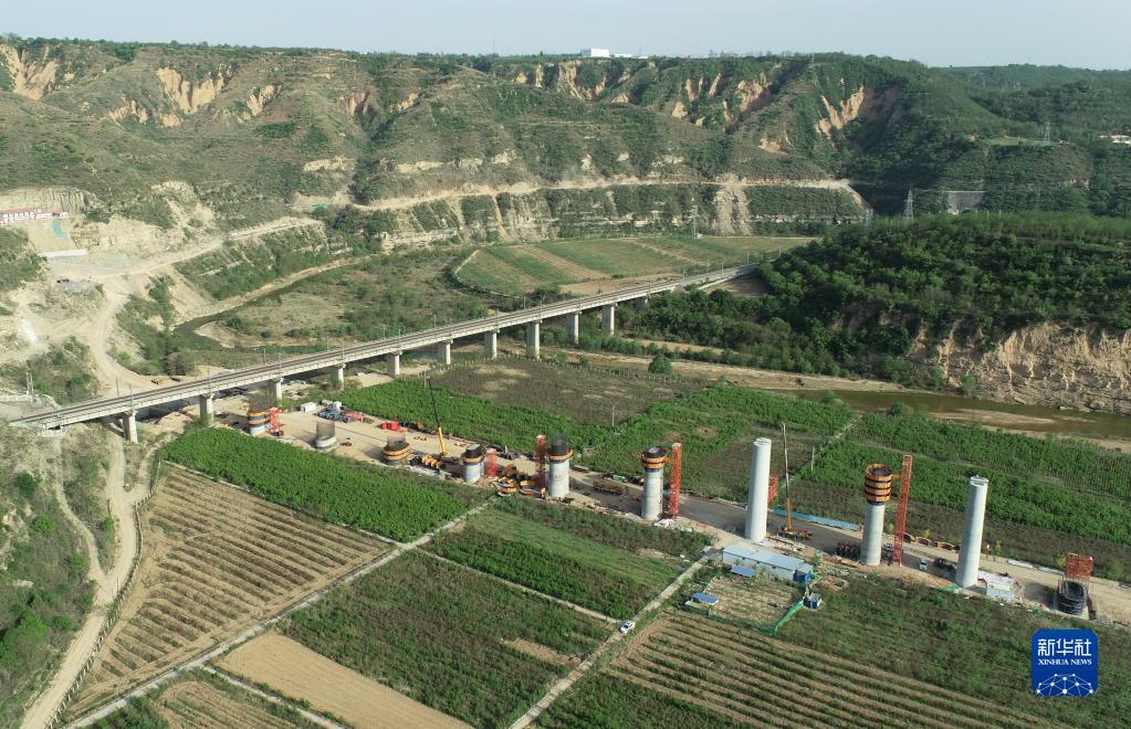 这是4月25日在延安市洛川县拍摄的西延高铁XYZQ-8标段交口镇北洛河特大桥施工现场(无人机照片)。
