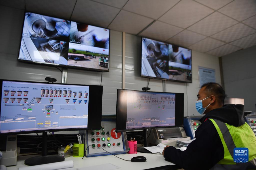 4月26日,中铁二十局工作人员在位于延安市洛川县的西延高铁XYZQ-8标段三号拌和站的控制室监控设备运行情况。