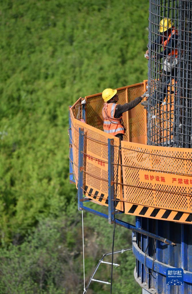 4月25日,中铁二十局施工人员在位于延安市洛川县的西延高铁XYZQ-8标段交口镇北洛河特大桥作业。