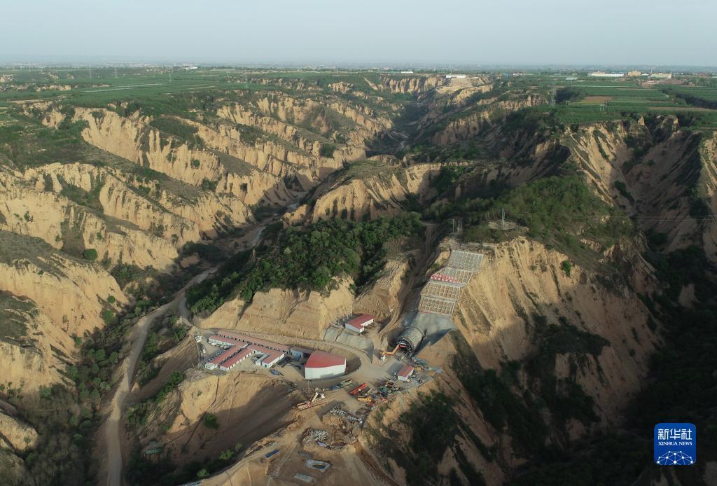 这是4月25日在延安市洛川县拍摄的西延高铁XYZQ-8标段安民隧道施工现场(无人机照片)。