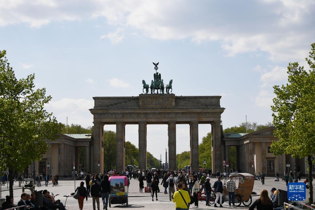 4月28日,游客在德国柏林勃兰登堡门东面的巴黎广场上游览。