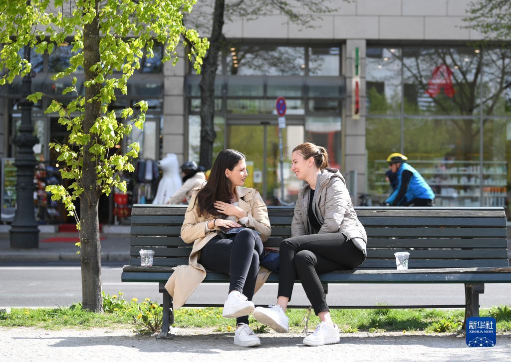 4月28日,两名女子在德国柏林菩提树下大街休闲。