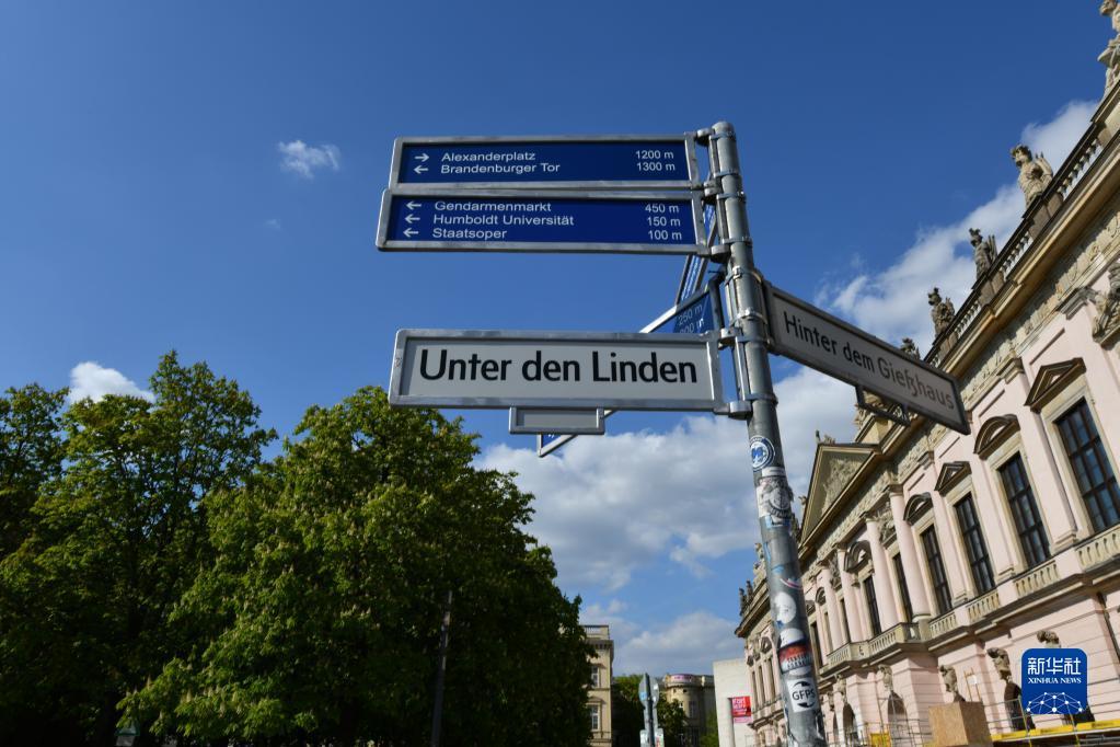 这是4月28日拍摄的德国柏林菩提树下大街路标。