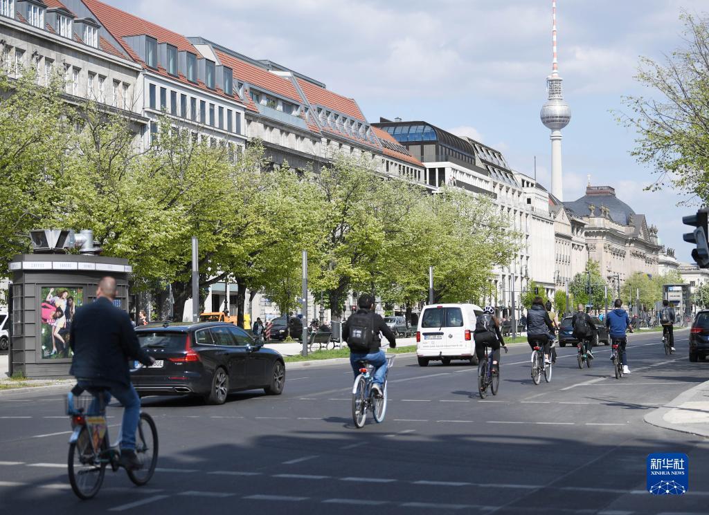 4月28日,人们在德国柏林菩提树下大街骑行。