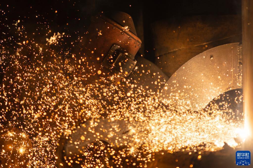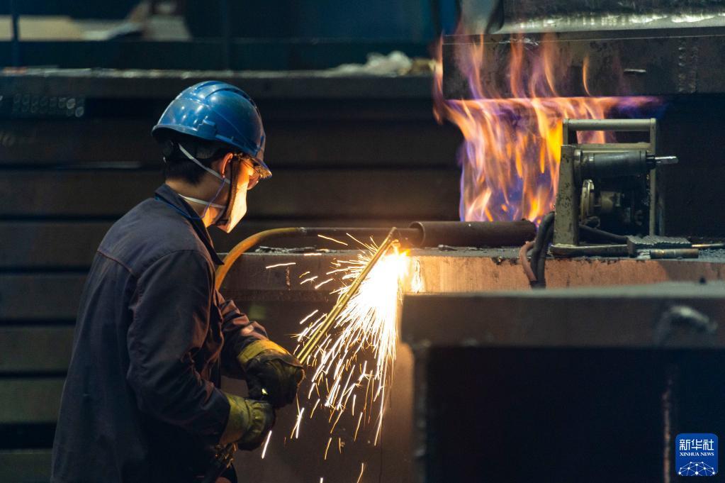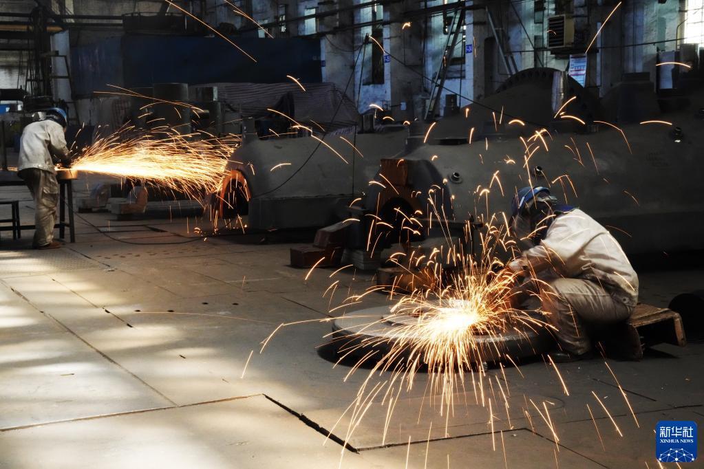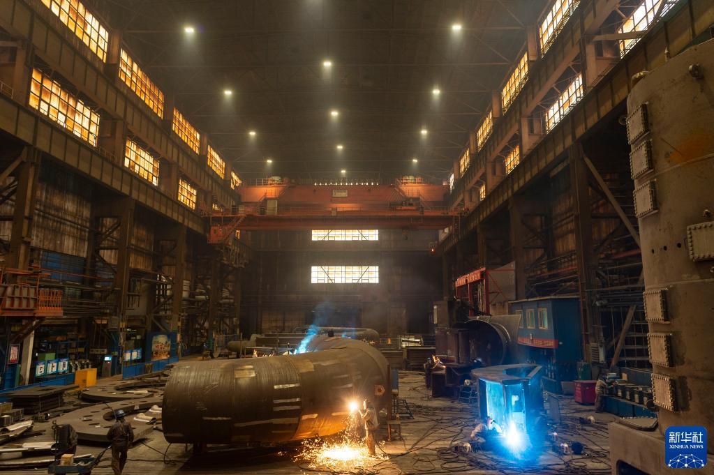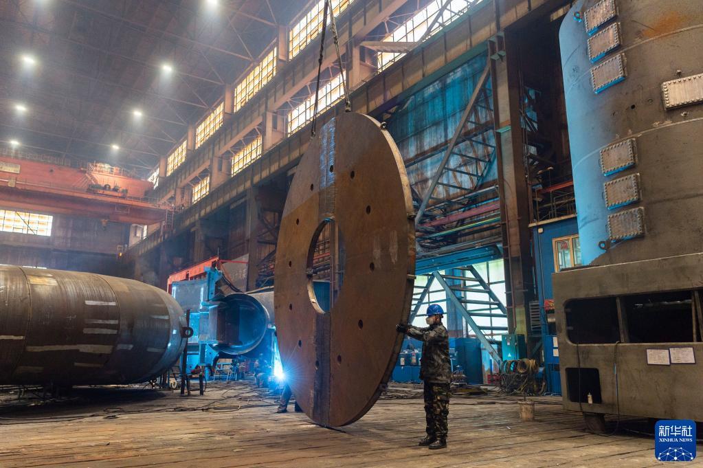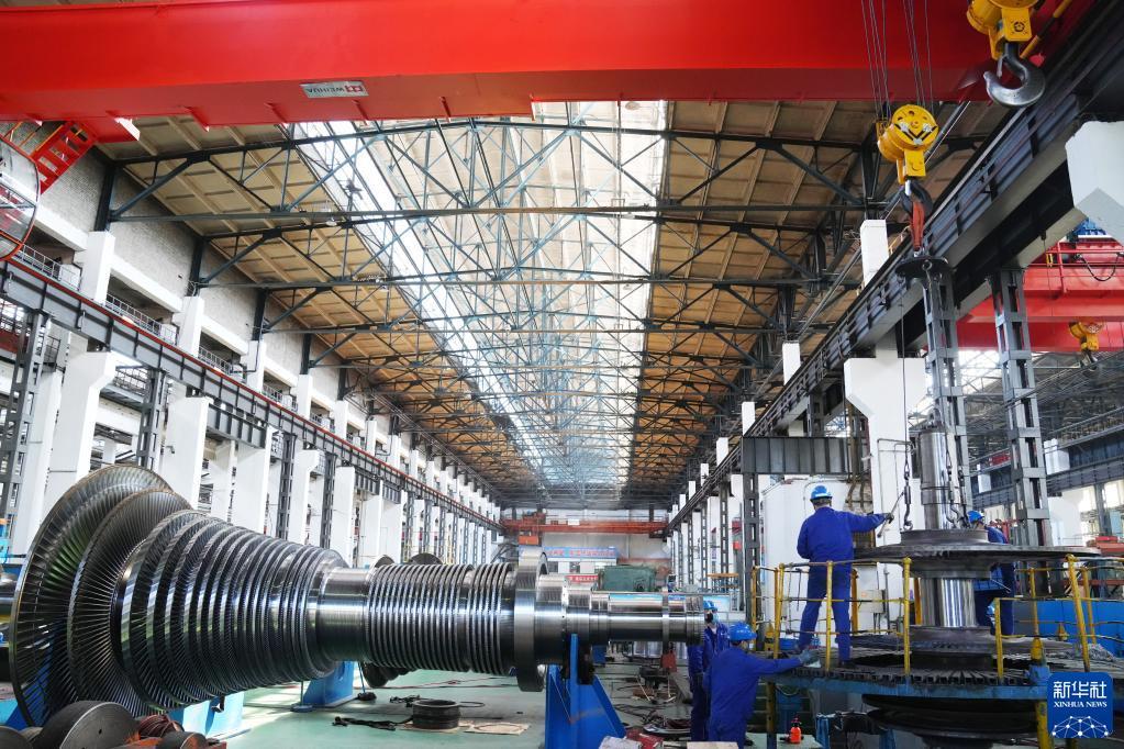 5月7日,在哈电集团哈尔滨汽轮机厂有限责任公司生产车间,工人在生产作业。