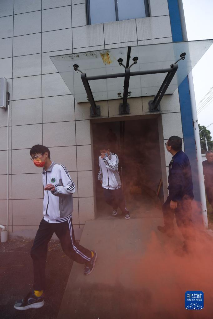 5月10日,昌化中学的学生在杭州市临安区昌化消防中队的训练楼里进行逃生应急演练。
