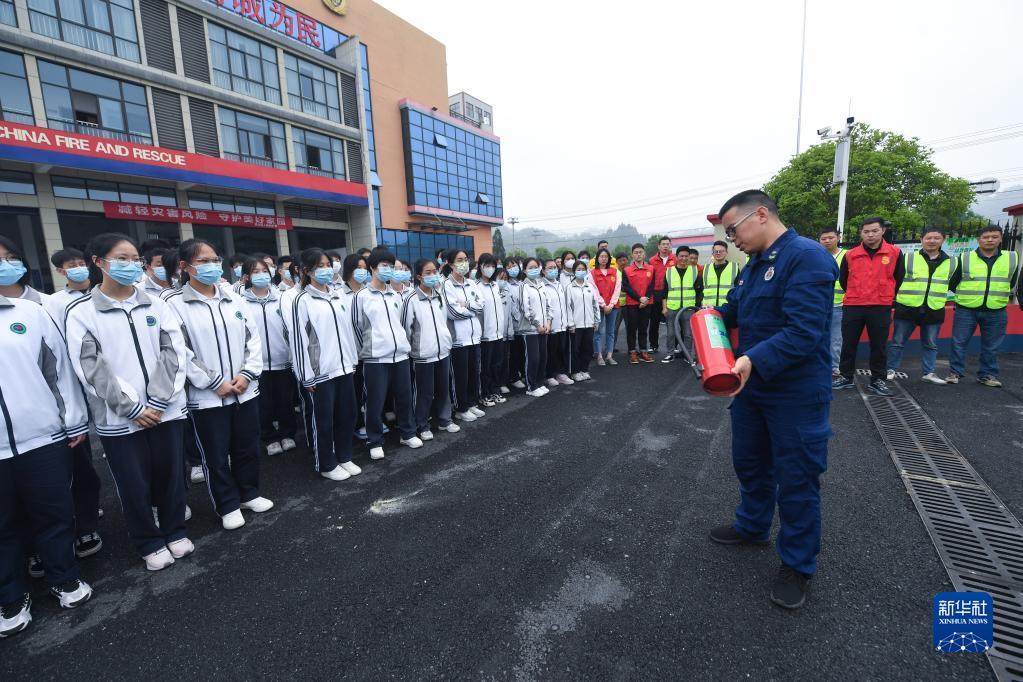 5月10日,杭州市临安区昌化消防中队的消防员在讲解正确使用灭火器。